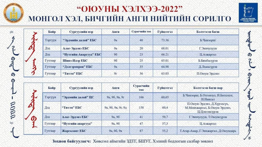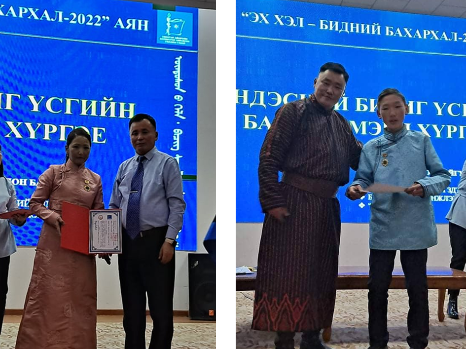 МХУЗ-ын багш М.Мөнхтуяа (Тэргүүлэх зэрэгтэй) нь Хөвсгөл аймгийн засаг даргын санаачилгаар үндэсний бичиг үсгийн өдрийг угтан зохион байгуулсан Эх хэл бидний бахархал-2022 аянд түүчээлэн оролцож ОЮУНЫ ХЭЛХЭЭ сорилго уралдааны Монгол хэл- багш ангилалд амжилттай оролцож ТЭРГҮҮН байр эзэллээ. Мөн салбарыг хөгжүүлэх үйл хэрэгт оруулсан хувь нэмэр, ажлын үр дүнг үнэлж Монгол Улсын Боловсрол, шинжлэх ухааны яамны ЖУУХ БИЧИГ -ээр шагнуулав.